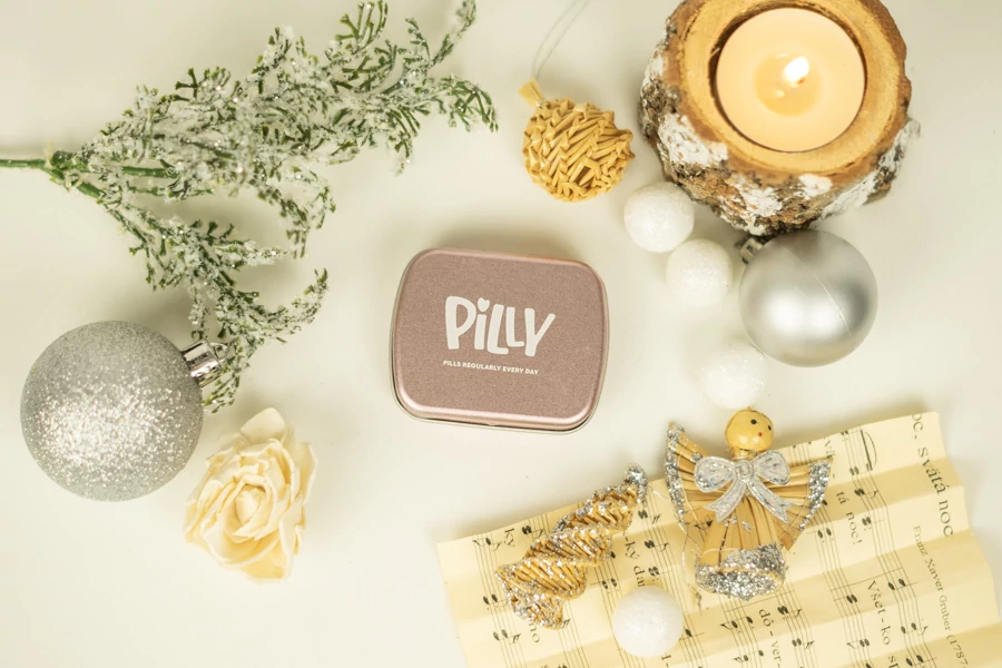 Kettes kiosztású vitamin- és gyógyszeradagoló rozéarany színben, amely napi két adag vitamin vagy gyógyszer elhelyezésére ideális.